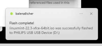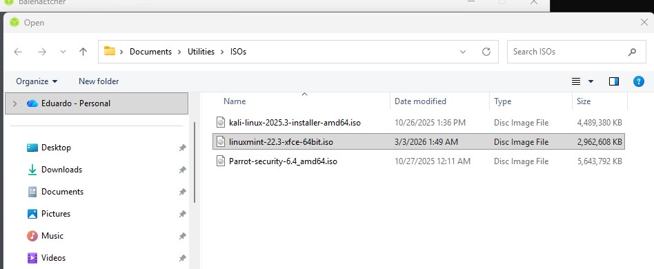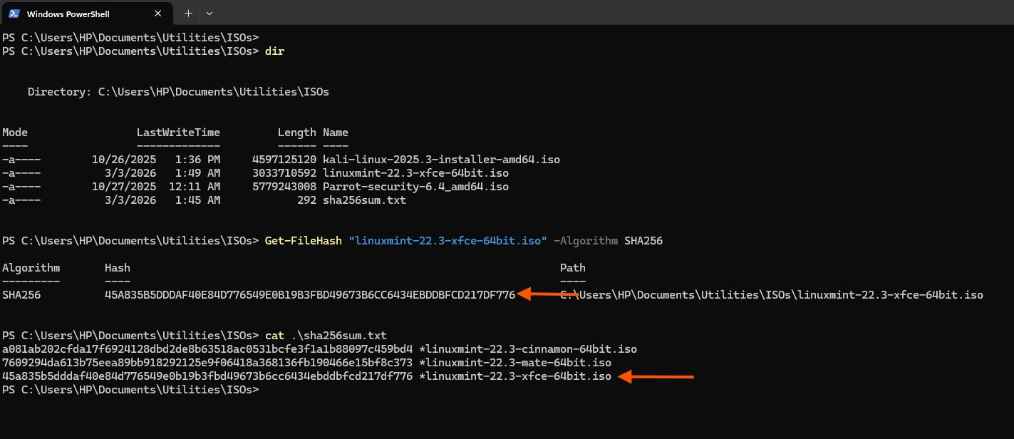 Get-FileHash "C:\Users\YourName\Downloads\linuxmint-22.3-xfce-64bit.iso" -Algorithm SHA256Compare the output against the SHA256 hash listed on the Mint download page next to the XFCE edition (file I suggested to download earlier). They should match exactly. If they don’t, re-download the ISO.