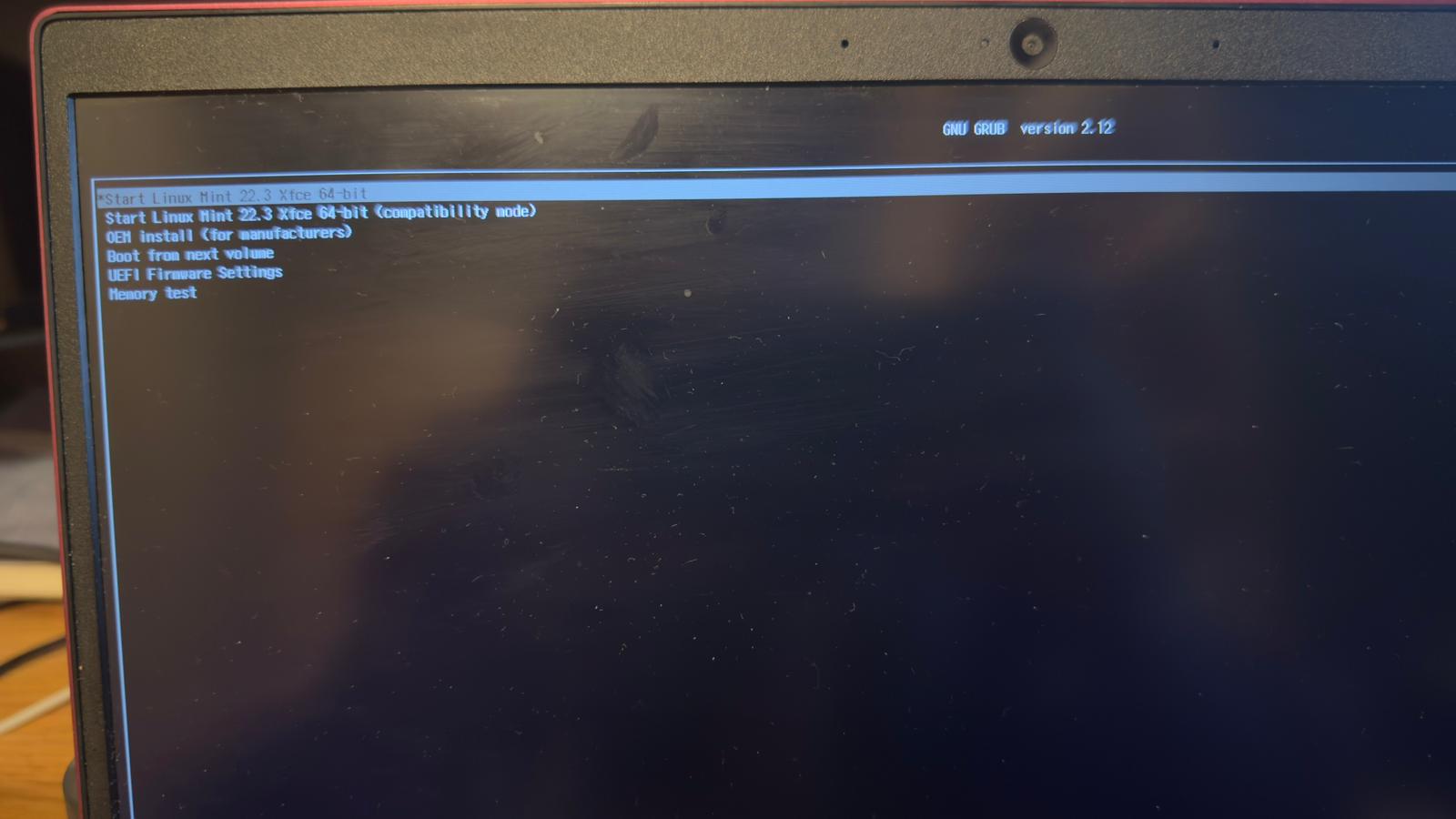 If the screen goes black after selecting Start Linux Mint, wait a few minutes first. This happened during my installation and I thought something had failed. The USB activity light was still blinking, which was the sign that it was still working. It came back on its own. If it doesn’t resolve after 10 minutes, reboot and at the boot menu highlight “Start Linux Mint”, press e, find the line containing quiet splash, replace it with nomodeset, and press F10 to boot. This forces software rendering and gets past most graphics-related boot issues on older Intel hardware.