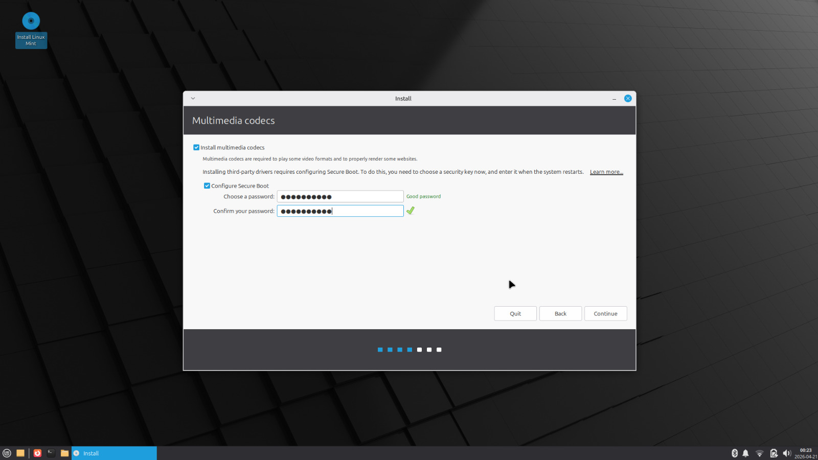 - Install multimedia codecs: check this box. It installs support for MP3, video playback, and other formats that can’t be bundled by default for licensing reasons. You want it. If Secure Boot is enabled on the machine, the installer may ask you to set a temporary password at this step to enroll a security key. If it does, set something simple since you’ll only need it once on the next reboot to confirm the enrollment.