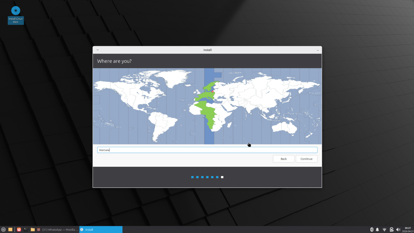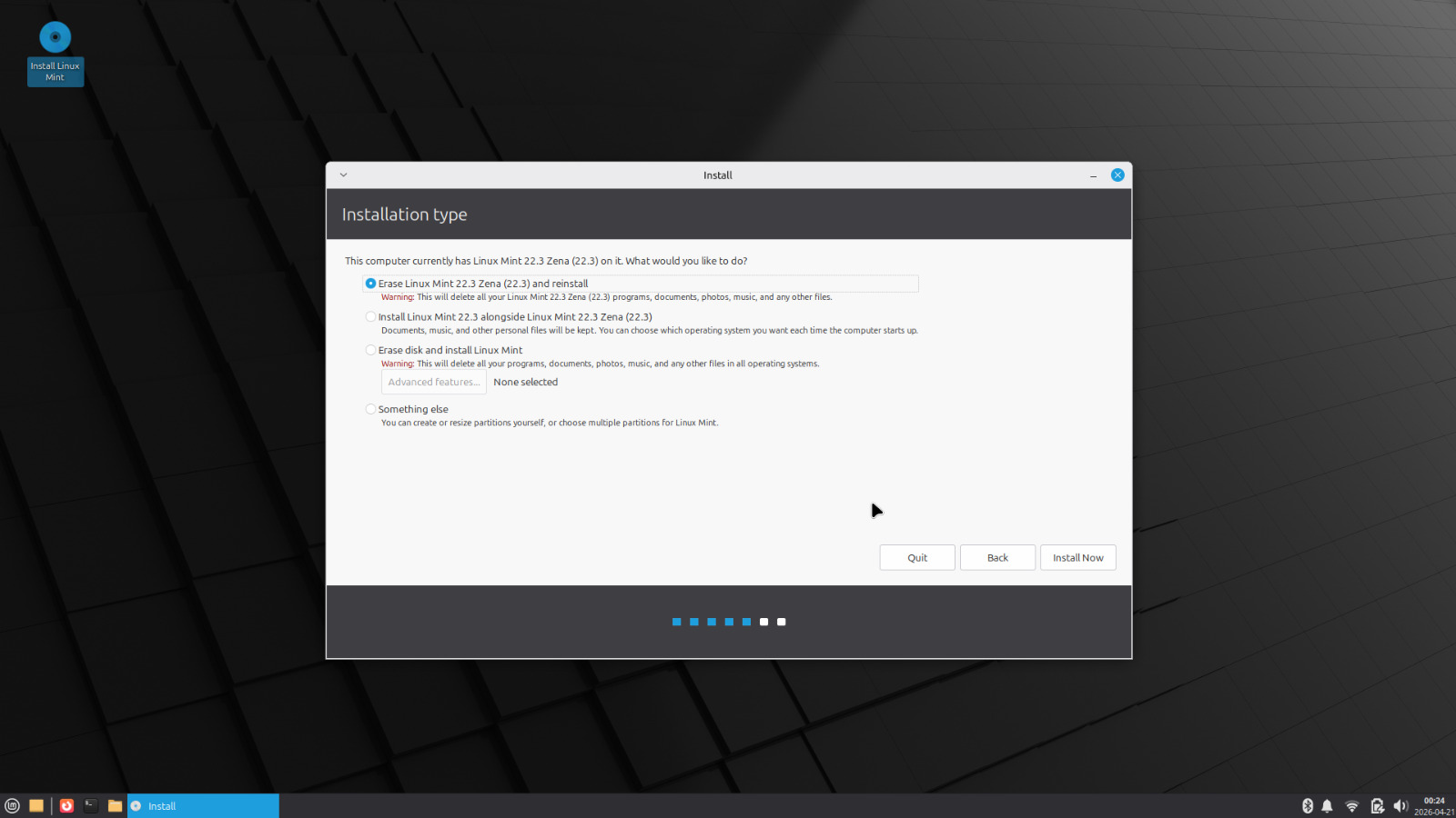- Installation type: this is the important screen. Select Erase disk and install Linux Mint. This wipes the internal drive and gives you a clean install. If you need to dual-boot Windows alongside Mint, the option exists but that’s outside the scope of this post.