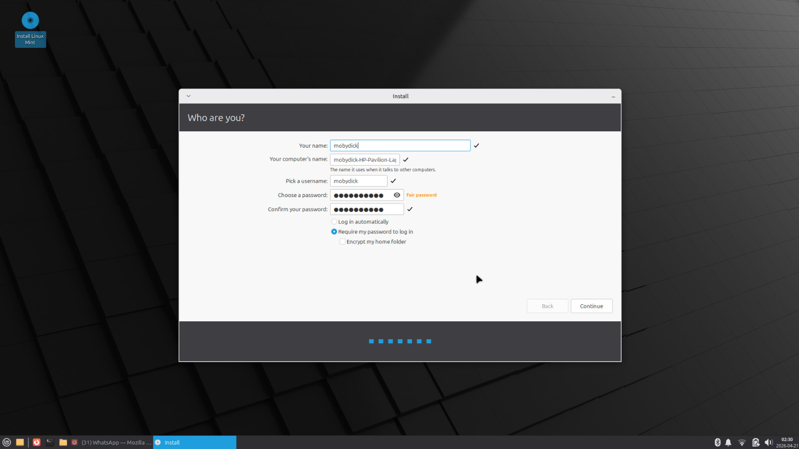 - User details: set your name, username, and password. The username becomes your home folder name, so keep it lowercase with no spaces.