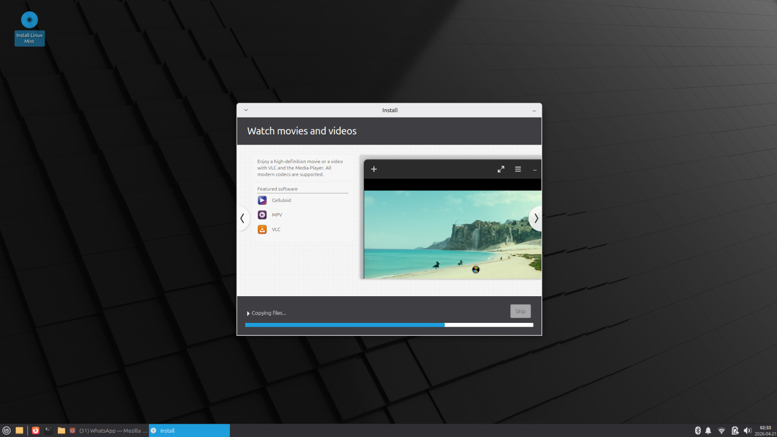 - Connect to WiFi: do this now if you want codecs installed automatically.