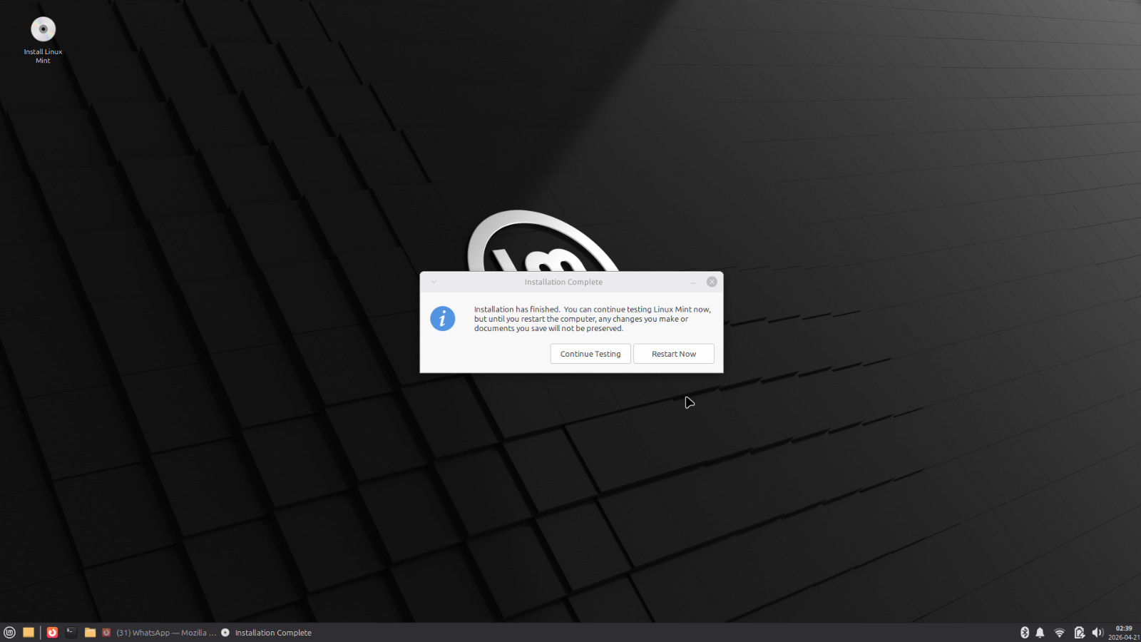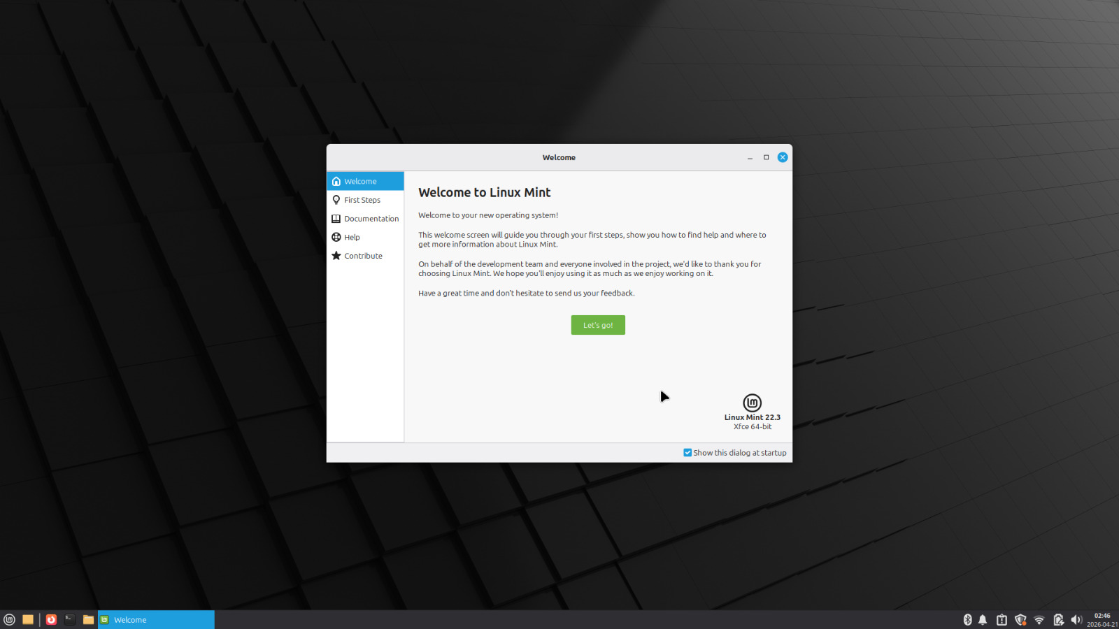 The system will boot into the installed Mint desktop. A welcome screen opens automatically. You can explore it or close it. The important things to do next are: