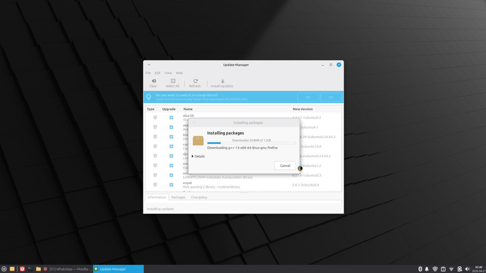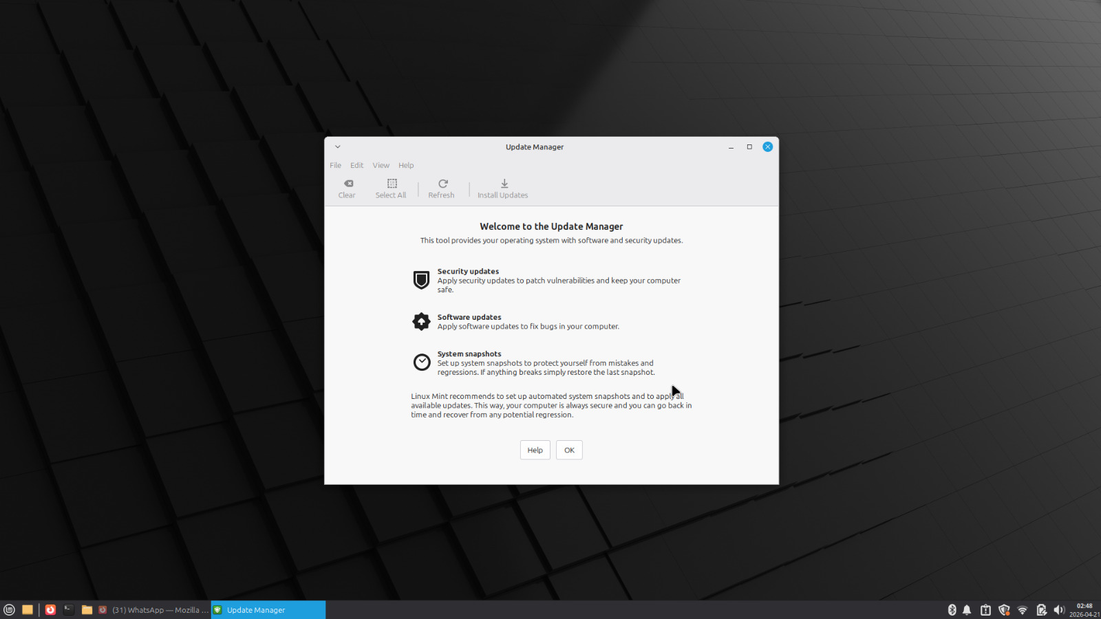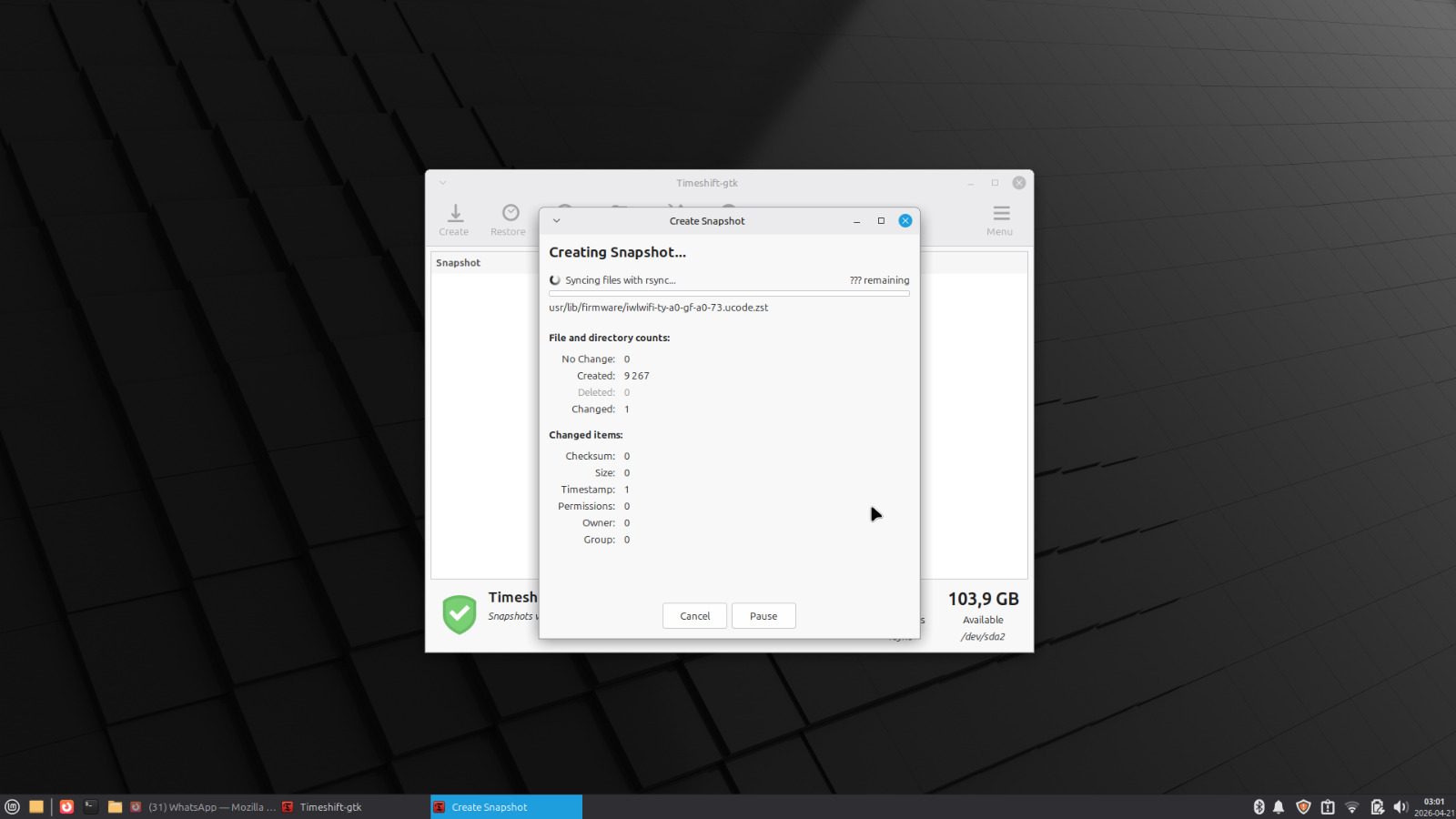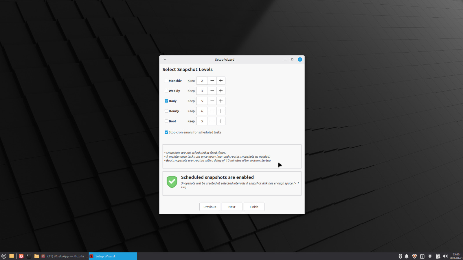 Set up Timeshift. This is Mint’s built-in system snapshot tool. Think of it as a rollback mechanism: if an update breaks something or you misconfigure the system, you can restore to the last snapshot in minutes. The first time you open Timeshift it walks you through setup. Take a snapshot after your first round of updates. Takes about a minute to run.