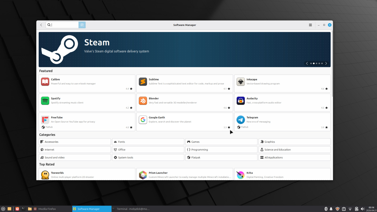 The Software Manager works like any app store. Search, click install, done. No terminal required. The catalog includes everything most people actually need: VLC, GIMP, Dropbox, Telegram, Spotify, LibreOffice, VS Code, and hundreds more. Apps without a Flatpak or .deb package are the exception, not the rule.