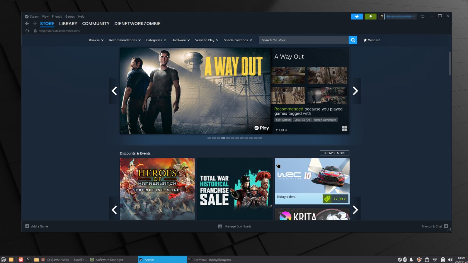 Steam runs on Linux. The installation takes one command or a click in the Software Manager. Valve has been investing in Linux gaming for years through Proton, a compatibility layer that runs a large portion of the Windows Steam catalog on Linux without any configuration. You don’t set anything up, you just enable it in Steam settings and install games normally.